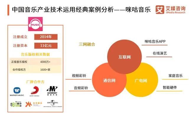 在咪咕音乐的发展中,与环球、华纳、索尼、太合、杰威尔、摩登天空、天娱、爱贝克思、KDM等千余家海内外唱片公司及版权代理机构、音乐综艺节目、影视原声发行制作机构等建立深度版权合作。