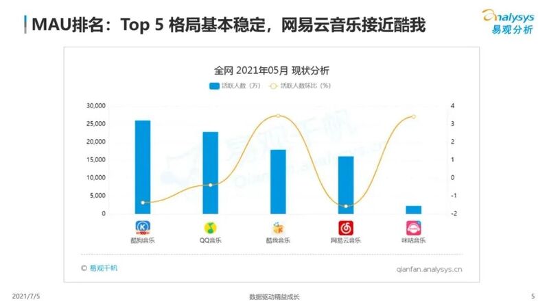 根据《2021在线音乐行业洞察报告》中显示,在产品方面,当前在线音乐细分市场的发展格局较为稳定,咪咕音乐仅次于腾讯音乐联盟和网易云音乐之后,不过位列第五位的咪咕音乐,在用户活跃度上却远远低于前两者。