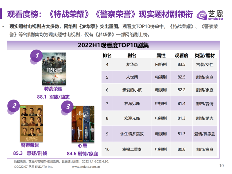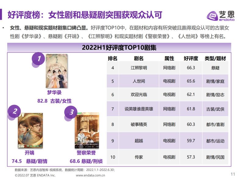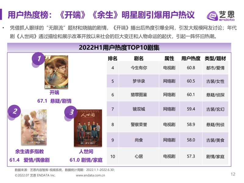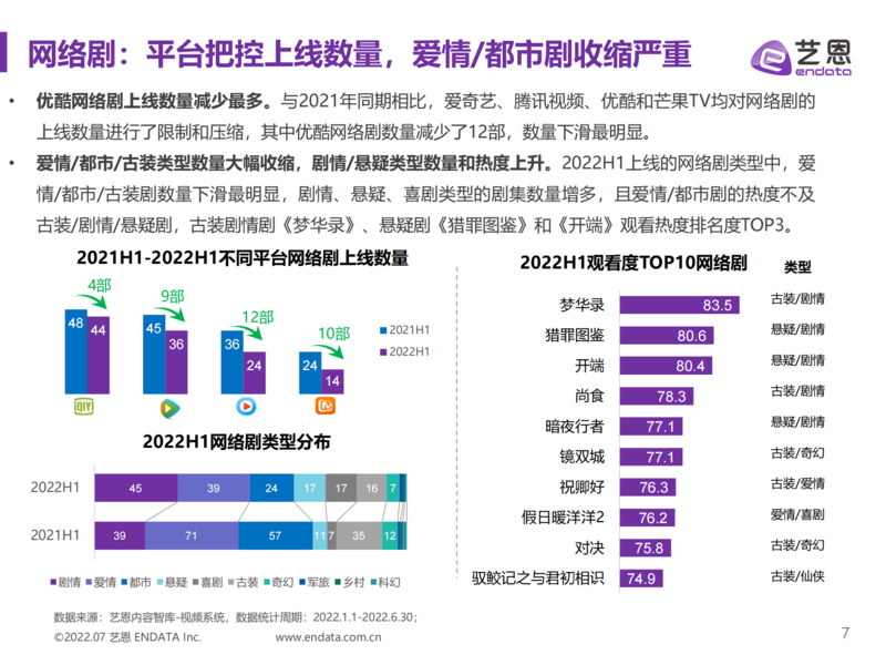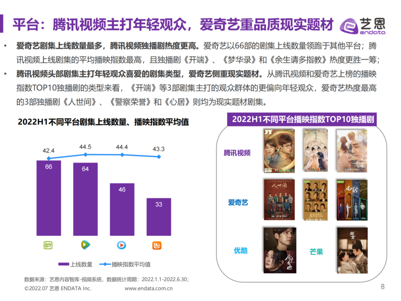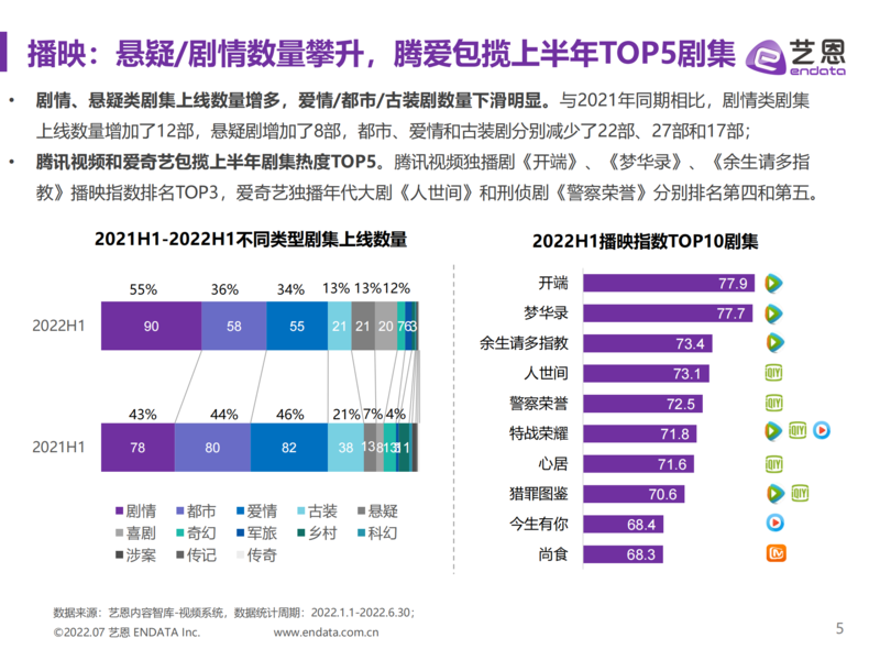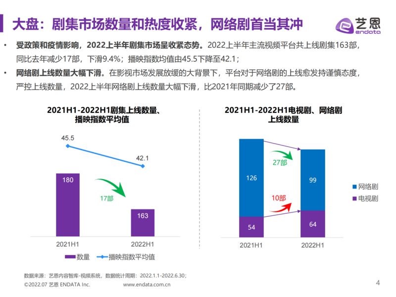 【流媒体网】摘要:2022上半年主流视频平台共上线剧集163部,同比去年减少17部,下滑9.4%;播映指数均值由45.5下降至42.1。(文末附有报告全文链接,欢迎今日流媒体VIP会员下载阅读!)
