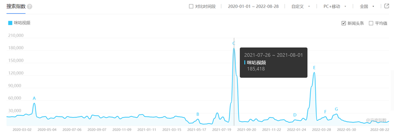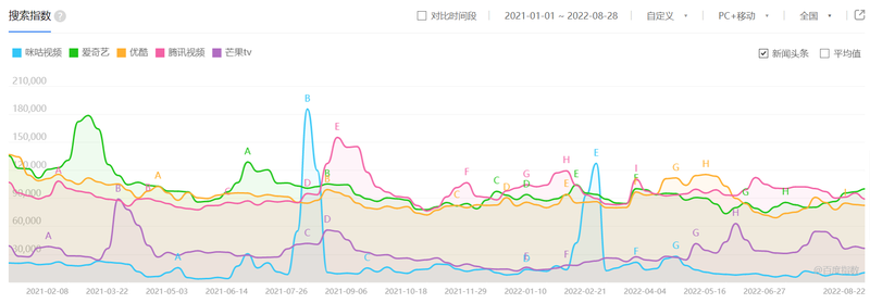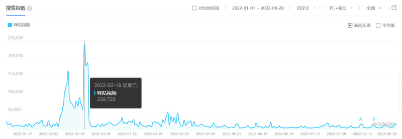 再拉长时间维度,从2021年1月1日到2022年8月28日,流媒体网发现,咪咕视频百度指数有两次大的爆发,一次是去年的东京奥运会期间,一次是今年的北京冬奥会期间,而且是平地起高楼的那种爆发。百度指数图显示,咪咕视频的日常搜索指数波动不大,这个变化放在跟爱优腾芒的对比图中更为醒目。在20个月的时间维度中,爱优腾的波峰波谷较多,且时间交错,应该与各家优势内容上线时间有关。而咪咕视频日常平缓,在重大赛事期间则变成陡峭的尖波。
