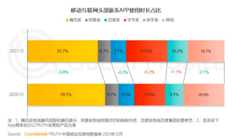 现如今的情况确实如此。在各大互联网公司主要APP的竞争中,内容恰恰是锁住用户时长的关键。根据QuestMobile的数据,2021年腾讯系的产品用户时长下降了3.8%,而字节系的产品在用户时长上则提升了5.2%。