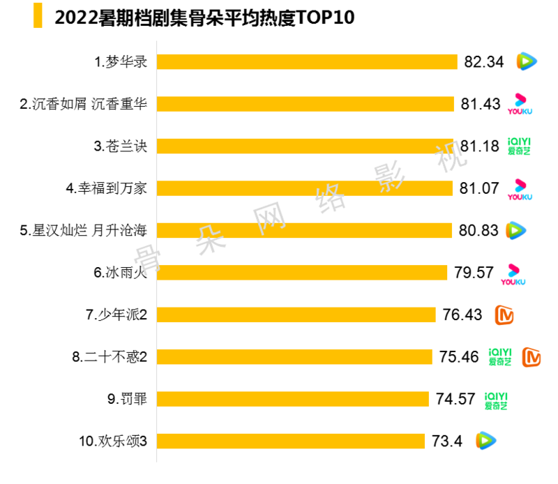 根据骨朵数据,暑期档平均热度排名前5的剧集分别是腾讯视频的《梦华录》《星汉灿烂》,优酷视频的《沉香如屑》《幸福到万家》,爱奇艺的《苍兰决》,而芒果TV热度最佳的《少年派2》排在第七。