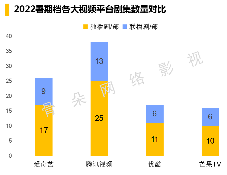 据统计,在2022年暑期档(6-8月)剧集全端播放市占率前20名中,腾讯视频独播和联播的剧集数量最多,一共有11部,而芒果TV最少,仅有4部。