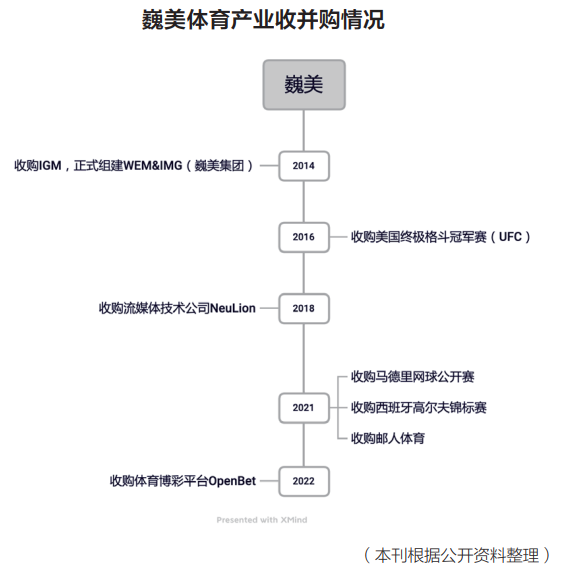 2016年,巍美收购了美国终极格斗冠军赛(UFC)的母公司,以50.1%的控股,成为这一综合格斗IP的实际控制方。2021年巍美以17.5亿美元的价格购买UFC余下 49.9%的股份,以便为可能的IPO提供更有利的条件。根据巍美的财报显示,2020年,巍美整体利润的80%源自UFC。在赛事运营上,巍美还于2021年收购了马德里网球公开赛以及西班牙高尔夫锦标赛,不断扩大在产业上游赛事方面的投入。除此之外,2018年,巍美收购了流媒体技术公司NeuLion,随后成立巍美直播品牌,为NFL、NBA、WWE等体育赛事提供流媒体解决方案。2022年,巍美收购体育博彩平台OpenBet作为其体育博彩系列产品的战略补充。通过收并购的方式,巍美拓展了体育传媒、体育博彩等体育产业周边业务。