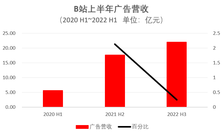 除此,2022年上半年,B站广告业务营收为21.99亿元,相比去年同期增长25%,而去年上半年的增速则是现在的8倍之多。