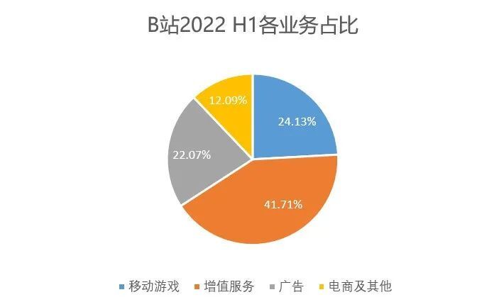 整体来看,B站的业务主要分为4个部分,包括移动游戏、增值服务、广告、电商及其他。其中,包括大会员、直播服务等在内的增值服务,已成长为B站的支柱性业务,2022年上半年,增值服务为总营收贡献了41.71%。