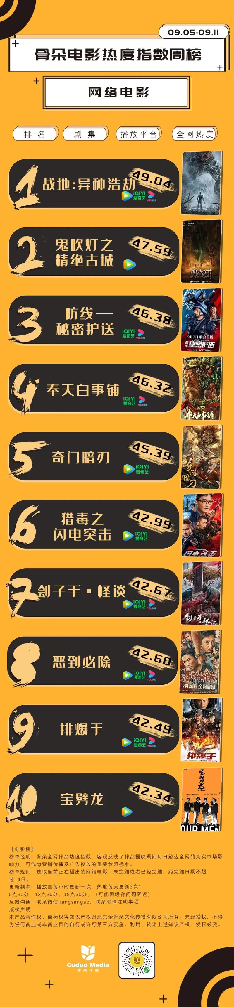 本周网络电影榜单第一由《战地:异种浩劫》夺得,上映4天,以49.04的全网热度登顶热度冠军。由新片场和众乐乐影视联合出品的《鬼吹灯之精绝古城》连续两周排名榜单第二;上映6天的军旅片《防线——秘密护送》以46.38的热度值位列第三。