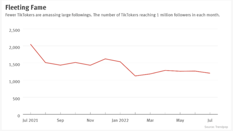 根据 trendpop 的一份最新数据显示,自 2021 年 7 月以来,TikTok 平台上拥有超过 100 万粉丝的创作者数量开始下滑,而到了今年年初更是出现了一次大幅度的滑坡。数据表明,自去年以来 TikTok 上百万粉丝体量的创作者数量的降幅达到 41%。具体来看,粉丝量达到百万的 TikToker 在 2021 年 7 月达到 2000 名左右,而到了 2022 年 7 月降至大约 1200-1300 人之间,流失了接近 800 人。