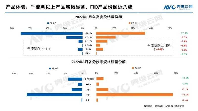 3、体验持续升级,千流明以上亮度产品份额增长14%,均价持续下探,FHD产品份额近八成;