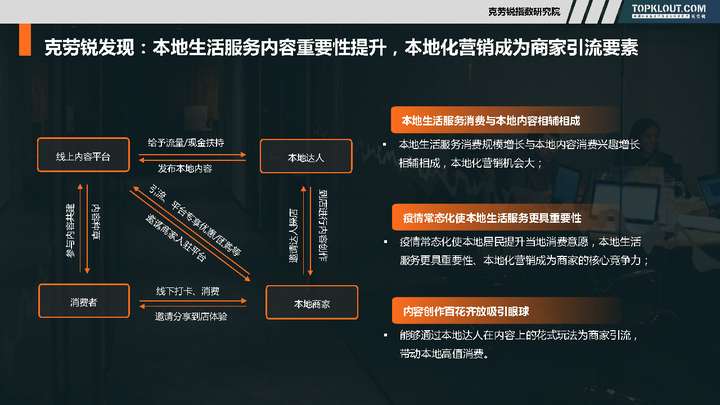 报告显示,互联网在国内本地生活服务市场的渗透率为12.7%,巨大的市场空间背后,是尚未完全释放的市场潜力。本地生活服务消费规模增长与本地内容消费兴趣增长相辅相成,本地化营销的机会相对较大。大背景下使本地居民的当地消费意愿有所提升,本地生活服务的重要性显现,本地化营销成为商家的核心竞争力,商家可以通过本地内容创作者进行引流,带动本地高值消费。