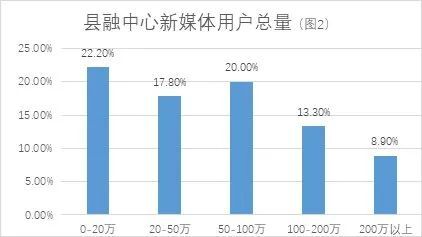 各县融中心的新媒体用户总量差距悬殊(见图1),差距最大的达100多倍,半数县融中心新媒体用户总量在100万以下,影响规模效益的产生。同时,各县融中心的经营收入差距也很悬殊,营收超过1亿元的头部县融中心有近10%,但是超过一半的县融中心营收在5000万以下,可见尚有不小的拓展空间。调查发现,县融中心的经营收入与新媒体用户总量存在正相关关系,因此提升用户总量和用户黏性有利于县融中心提升营业收入。