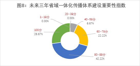 调查显示,多数受访的县融中心认为,未来三年加强全省性新闻一体化传播体系建设非常重要和迫切,其中68.89%受访者对一体化传播体系建设的重要性指数打分在80分以上(见图5)。