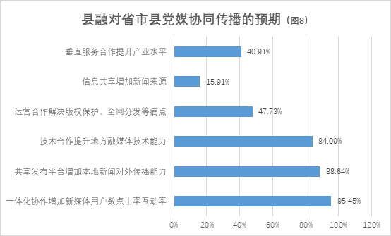对于省域平台化战略引领的省市县协同传播(见图6),受访的县融中心希望借此为自身注入一些新的活力。调查中按提及率从高到低排列,县融中心最希望通过一体化协作增加新媒体用户数、点击率、互动率,比例高达93.33%;其次是通过共享发布平台增加本地新闻对外传播能力(86.67%),接下来是通过技术合作提升地方融媒体技术能力(82.22%)、通过运营合作解决版权保护、全网分发等痛点(46.67%)等。