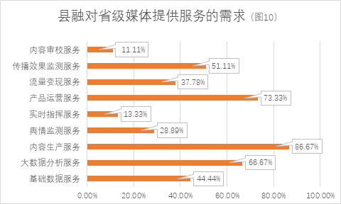 在技术应用方面(见图8),县融中心最希望省级媒体提供内容生产服务,需求高达86.67%,足见“内容为王”依然是县融中心的发展准则,也是其发展瓶颈。产品运营服务需求高达73.33%,大数据分析服务需求达66.67%,这两项也是县融中心的发展短板,接下来还希望省级媒体提供传播效果监测服务、基础数据服务、流量变现服务、舆情监测服务等。