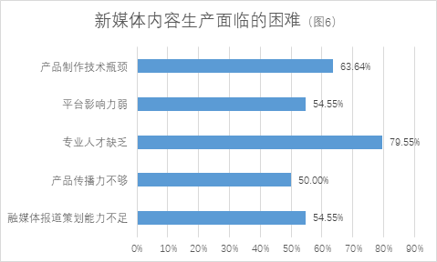 在新媒体内容生产方面(见图4),按提及率从高到低排序,县融中心面临的最大困难是专业人才缺乏,高达77.78%,其次是产品制作技术瓶颈(62.22%)、平台影响力弱(53.33%)、融媒体报道策划能力不足(53.33%)、产品传播力不够(48.89%)等因素。
