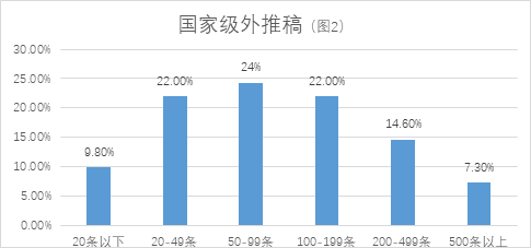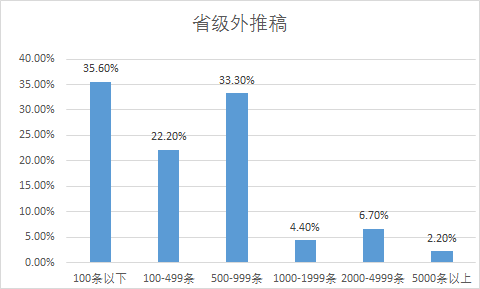 一个值得关注的问题是,县融中心的传播力有限,县域之外的传播能力较弱,59%的县融中心有提升本地外传播能力的强烈需求。近半数县融中心去年一年在国家级平台上发布的外推稿不足100条(见图2),半数以上县融中心在省级平台上发布的外推稿不足500条(见图3)。