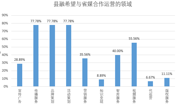 在合作运营领域上(见图7),传播服务、品牌策划、活动策划三项最受县融中心欢迎,提及率均近78%,也是其迫切需要提升的领域。接下来按提及率高低,依次为视频服务(55.56%)、智库服务(40%)、营销服务(35.56%)、宣传广告(28.89%),而版权服务、知识变现、代运营等合作需求提及率不高。