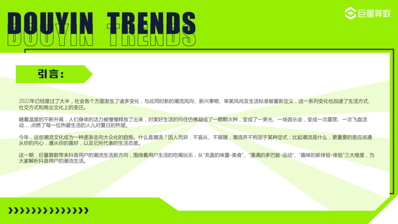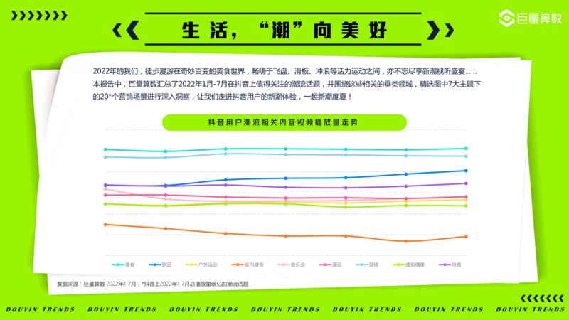【流媒体网】摘要:围绕着用户生活的吃喝玩乐,从“充盈的味蕾-美食”、“漫涌的多巴胺-运动”、“趣味的新体验-体验”三大维度,为大家解析抖音用户的潮流生活。(文末附有报告全文链接,欢迎今日流媒体VIP会员下载阅读!)