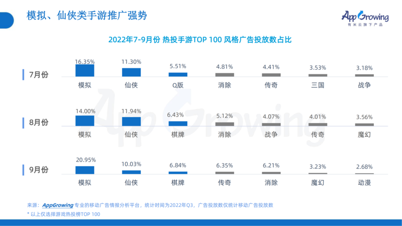 2、微信小游戏成为流量风口,中重度游戏依旧保持高强度投放,其中传奇、模拟、仙侠类手游Q3期间投放强势,7-9月期间连续稳居手游热投风格前三。