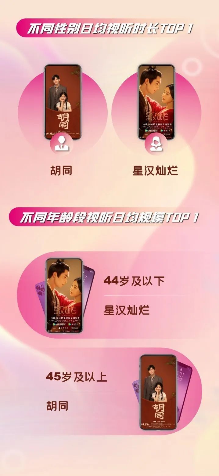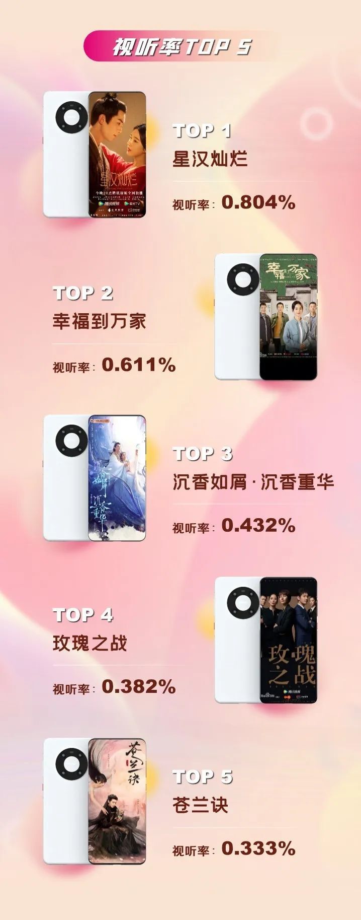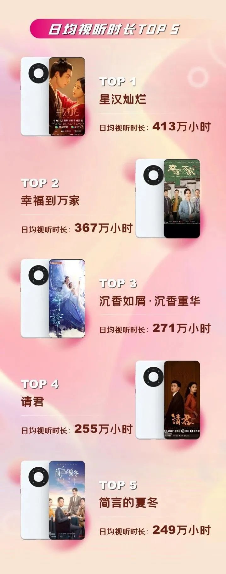 CSM 移动小屏数据显示,2022年第三季度在播的55部剧目总视听时长达到21.74亿小时。古装家族群像剧《星汉灿烂》不仅荣获中美电视节年度最佳网剧奖,还在“日均用户规模TOP榜”“单日用户规模峰值TOP榜”“日均视听时长TOP榜”“视听率TOP榜”“女性日均视听时长TOP榜”“44岁及以下年龄段日均视听时长TOP榜”等多项指标中成功霸榜,跃居第三季度最受关注的爆款剧目。