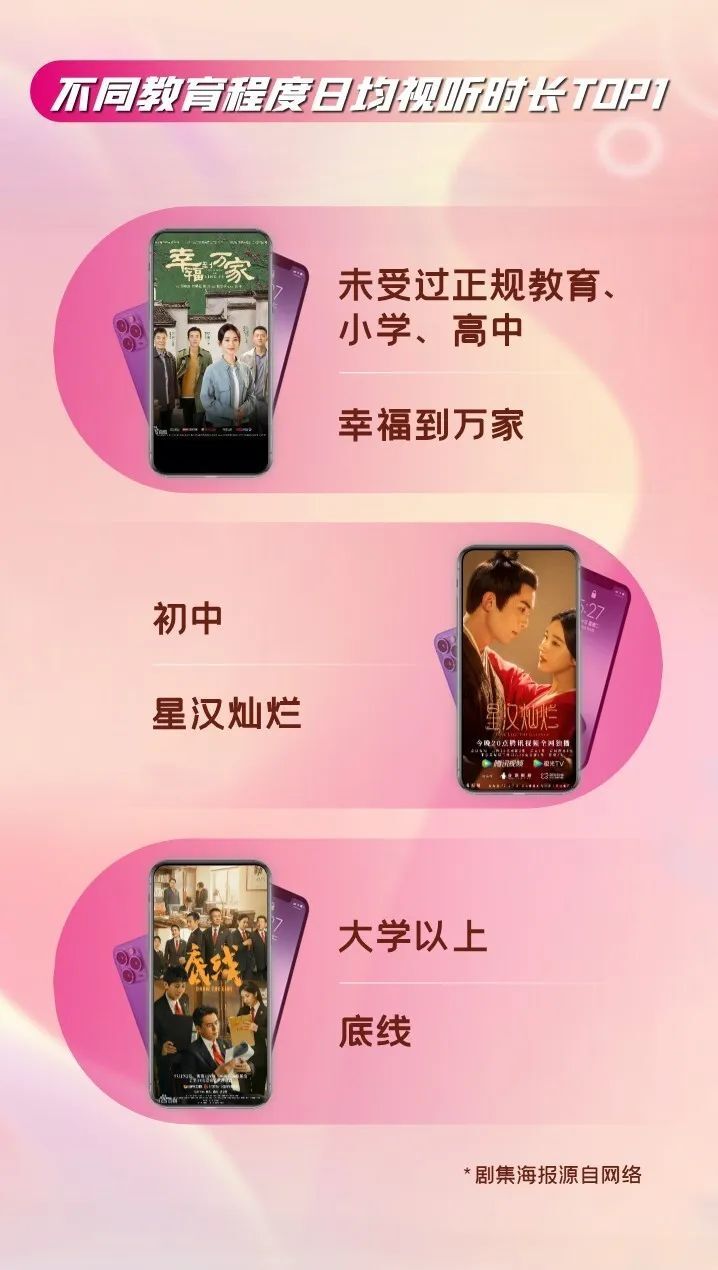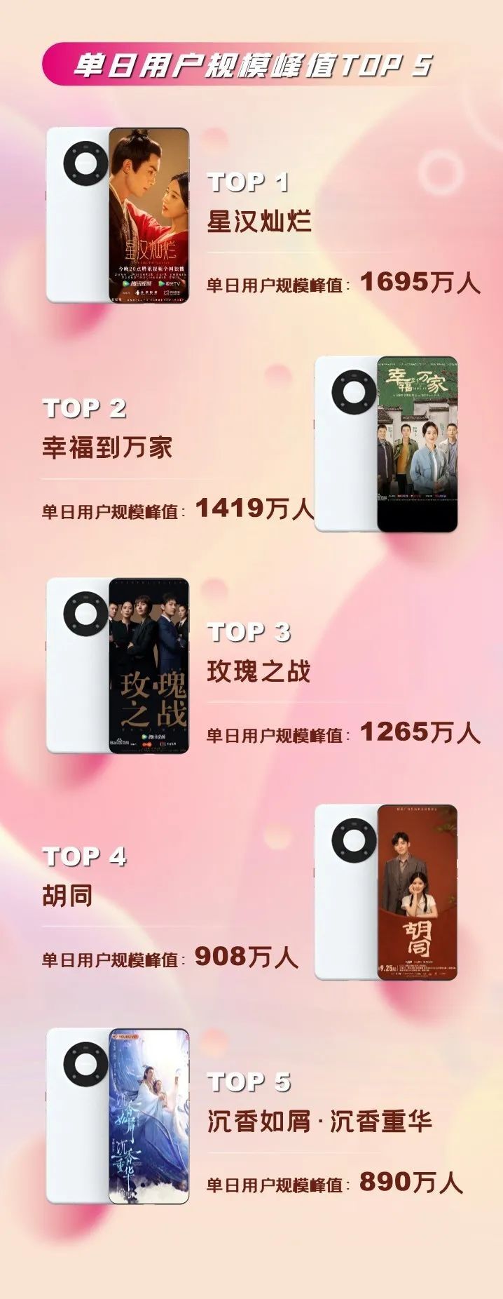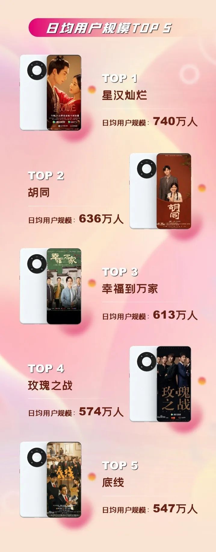 CSM 移动小屏数据显示,2022年第三季度在播的55部剧目总视听时长达到21.74亿小时。古装家族群像剧《星汉灿烂》不仅荣获中美电视节年度最佳网剧奖,还在“日均用户规模TOP榜”“单日用户规模峰值TOP榜”“日均视听时长TOP榜”“视听率TOP榜”“女性日均视听时长TOP榜”“44岁及以下年龄段日均视听时长TOP榜”等多项指标中成功霸榜,跃居第三季度最受关注的爆款剧目。