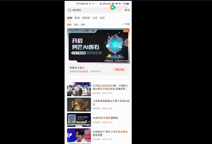 在芒果TV搜索数字藏品,可以直接进入相关频道,平台内容等同于公众号“芒果数字藏品”,而公众号购买是跳转芒果TV;而芒果旗下的小芒APP也有部分自有数字藏品出售。