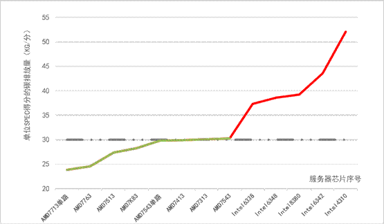 服务器使用阶段内算力碳效实测值如图2所示,测试结果显示,在服务器使用周期为5年的情况下,单位算力性能的碳排放量在20kg~60kg之间。由于IT设备特别是服务器在数据中心能耗中占比极大,数据中心的碳排放将在很大程度上取决于服务器和芯片,这逐渐成为数据中心绿色低碳发展的关键。
