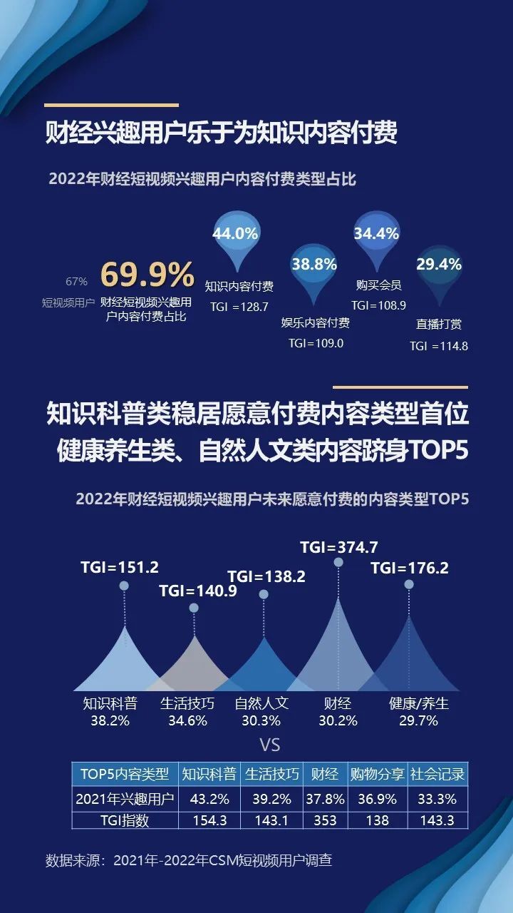 知识科普类稳居愿意付费内容类型首位,健康养生类、自然人文类内容跻身TOP5。具体到财经兴趣用户愿意付费的内容类型,TOP5为知识科普、生活技巧、地理历史、财经、健康养生。从TGI指数来看,财经兴趣用户对财经、健康养生类内容的付费意愿最明显,成为区别于短视频用户的显著特征。对比2021年财经兴趣用户愿意付费内容类型TOP5,健康养生、自然人文类内容付费意愿增长明显、升至2022年付费意愿TOP5内容类型。财经兴趣用户对自然人文、健康养生内容的较高需求,促使其未来愿意为相关内容知识“买单”。