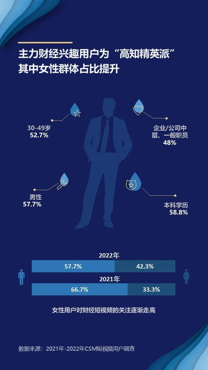 高学历属性凸显,主要从事职业为企业/公司中层、一般职员。受过良好教育的职场精英更偏好财经内容,CSM调查数据显示,在财经短视频兴趣用户中,学历为本科的占比达58.8%;职业为企业/公司中层、一般职员的兴趣用户占比达48%。在拥有稳定工作、持续收入的前提下,中高收入群体具有较强的理财观念和资产管理需求,更多用户加入到关注个人资产管理的队伍中。