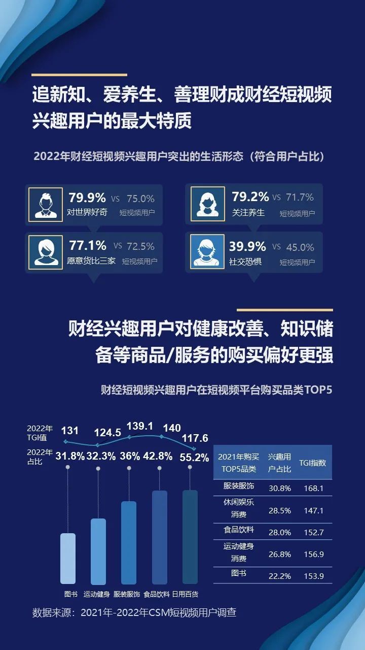 财经兴趣用户注重消费性价比,对于健康改善、知识储备等商品/服务的购买偏好更强。CSM 2022年调查显示,财经兴趣用户在短视频平台购物的TOP3品类为日用百货、食品饮料、服装服饰等生活“刚需品”,但在运动健身、图书商品的消费占比上明显高于短视频用户整体水平。从TGI指数来看,相比短视频用户,财经兴趣用户对食品、服饰等生活用品的购买偏好更强,其运动健身、图书的购买偏好也更突出,TGI值均大于100,他们对于健康的重视和知识的追求,促使其更多购买相关商品。