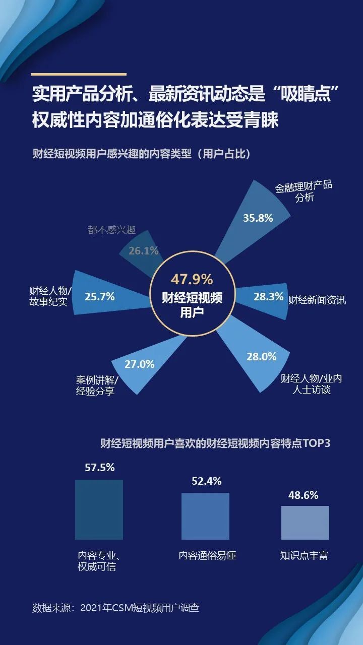 实用产品分析、最新资讯动态是“吸睛点”,权威性内容加通俗化表达受青睐。对于观看过财经短视频的用户来说,助力决策和理财实践的内容更易获得他们的偏爱。CSM 2021年针对财经垂类的调查显示,金融理财产品分析、财经新闻资讯、专业人士访谈是财经短视频用户最感兴趣的内容类型。同时,财经短视频用户认为财经短视频应具备内容权威可信、通俗易懂、知识点丰富等特点,兼具权威性内容与通俗化表达的财经短视频成为“流量密码”。