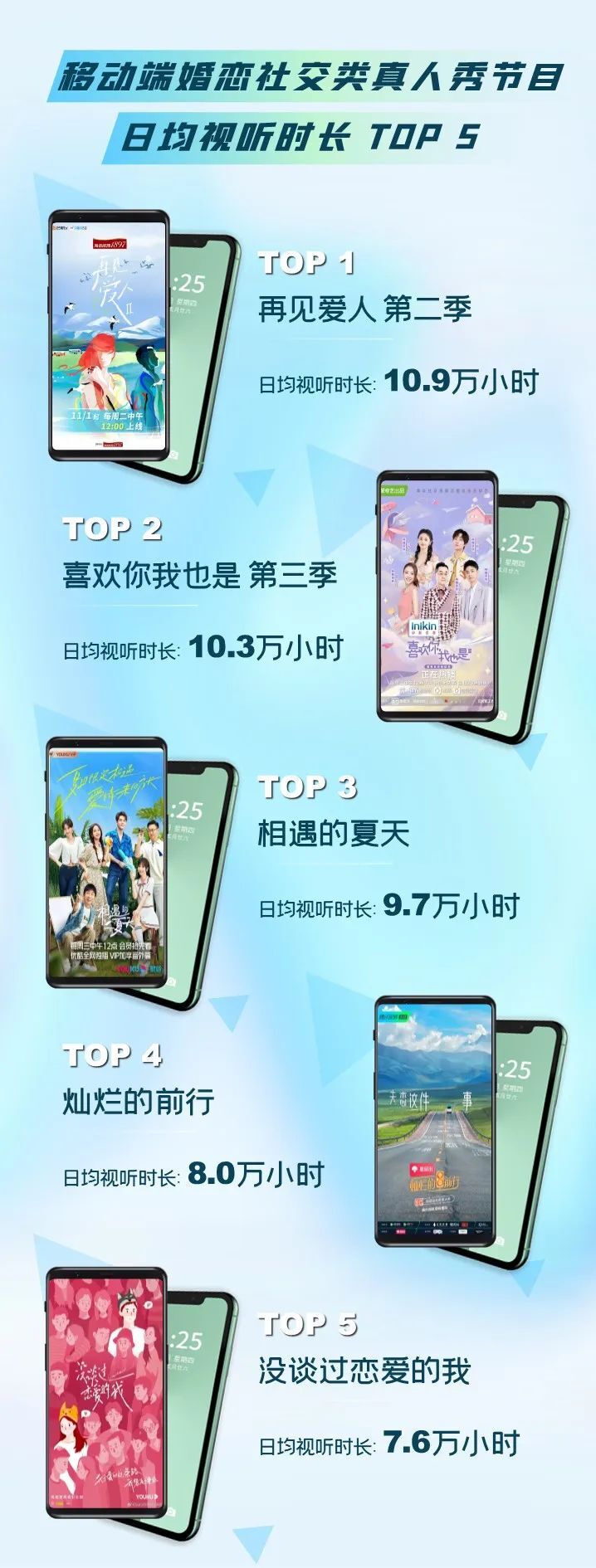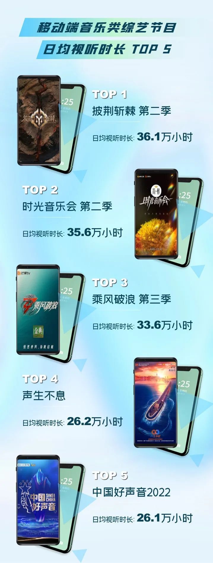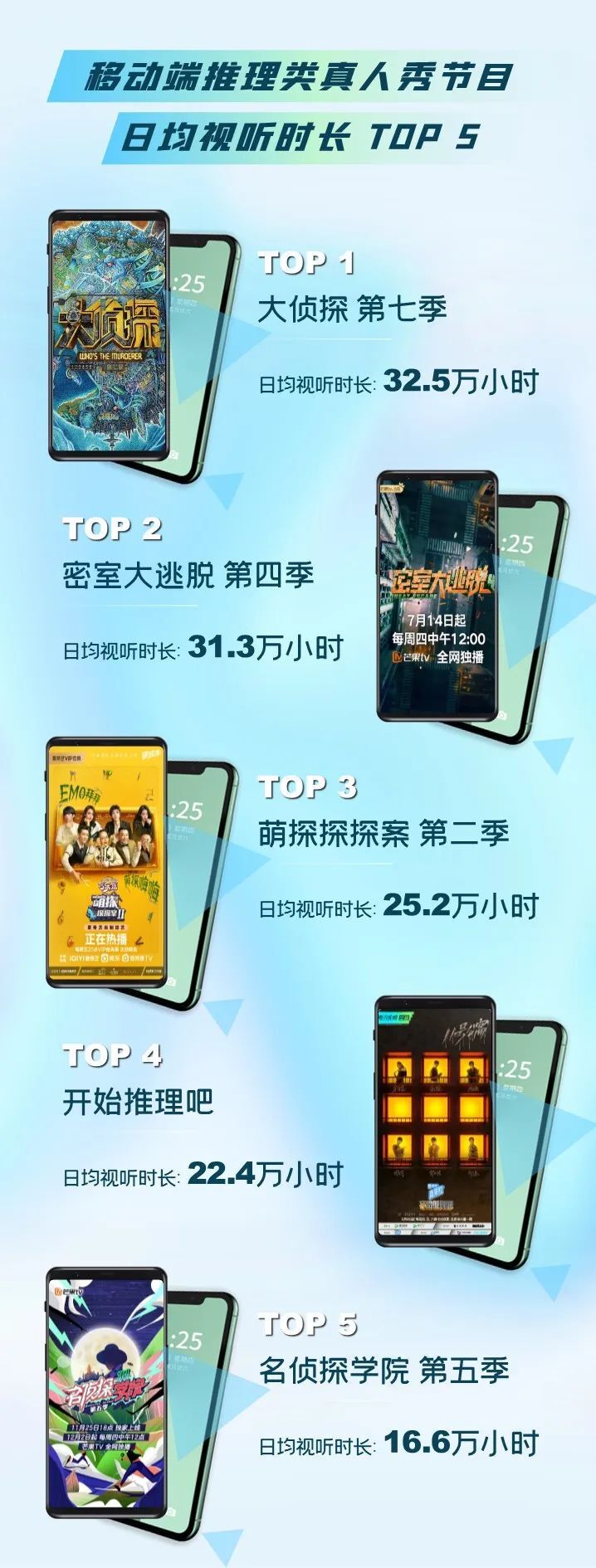 以烧脑剧情和悬疑推理主打的推理真人秀节目《大侦探7》《密室大逃脱4》《萌探探探案2》,以其逻辑缜密的剧情,精准捕获多圈层受众,在推理赛道上成功杀出,冲进“移动端推理类真人秀节目日均视听时长TOP榜”前三甲。尽显生命力的音乐综艺,凭借“浪姐”“披哥”等火热综艺IP强势破圈,点燃音综市场。《披荆斩棘2》《时光音乐会2》等多部音综,情怀与浪漫并存,以其强劲的感召力与治愈力,抚平观众内心,谱写数代人的青春往事。除此之外,还有多部综艺节目跻身移动端视听不同指标的头部行列,一批有口皆碑的综艺成功抓住观众眼球,优质内容谱写综艺市场新旋律。从数据特征来看,以下季播综艺成为2022年的移动端视听亮点。