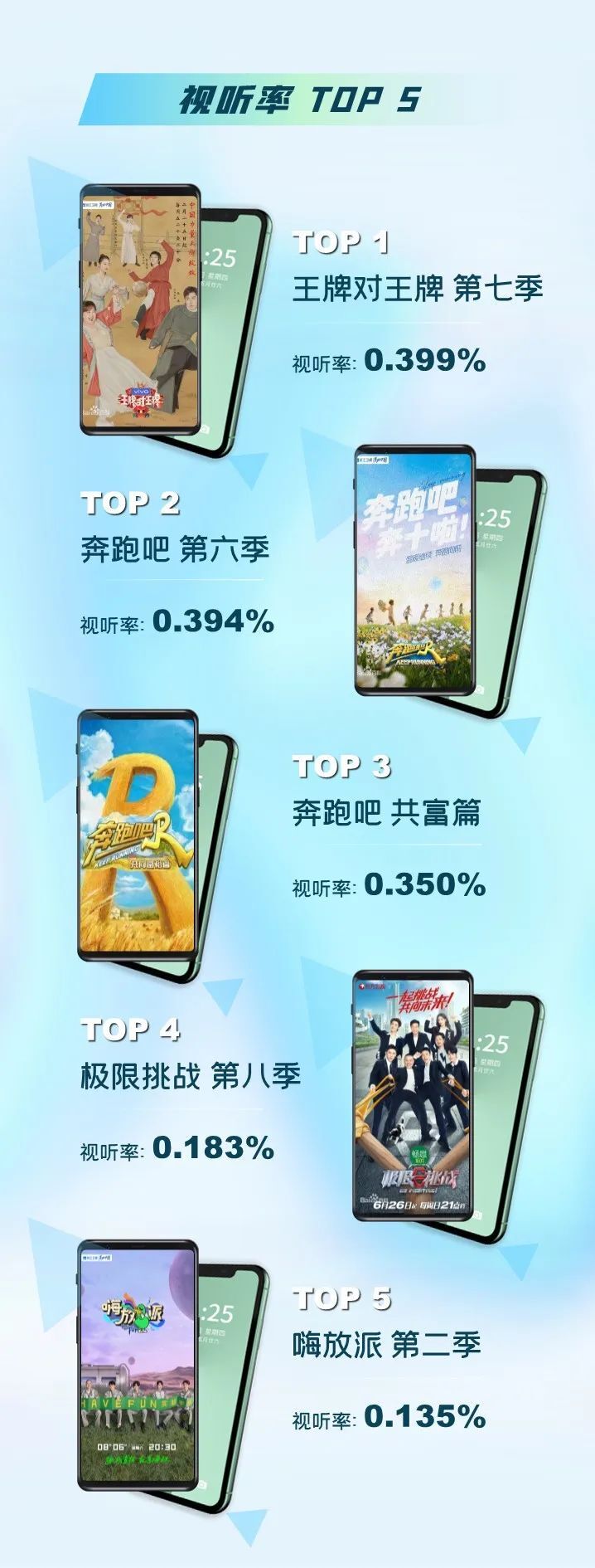 据CSM移动端数据显示,2022年监测的190档季播综艺节目中,“综N代”高热不减持续霸屏,“视听率TOP榜”五强强势出炉,分别是游戏竞演类综艺《王牌对王牌7》《奔跑吧6》《奔跑吧 共富篇》、励志体验真人秀《极限挑战8》和奇趣实验体验类真人秀《嗨放派2》。