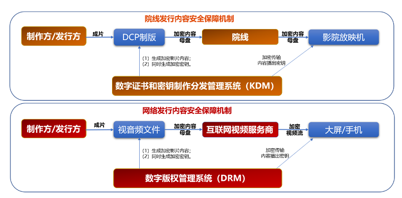 就已经商用的技术而言,DRM技术是一项集权利保护、使用控制与管理为一体的新兴技术。它在原理上与现行影院放映体系使用的DCI技术相同,从内容源头即采用加密传输,播出终端部署硬件级DRM保护能力,打通制作方到播出终端的端到端的加解密传输链路,即可实现与影院发行体系相同级别的安全保障机制。这对于解决院线影片等高价值内容在数字发行阶段要应对的盗版侵权威胁,保护院网同播PVOD这样的新商业模式发展,可以起到关键作用。在该领域,ChinaDRM是中国自主可控的DRM解决方案,是中国影视行业保护版权的首选技术方案。
