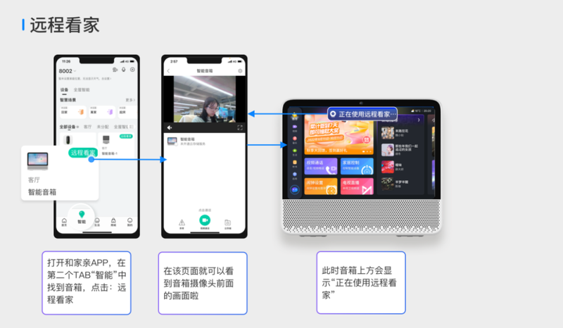 在音箱通电状态时,用户可通过和家亲APP查看音箱摄像头的实时监控画面和异常事件回放,同时支持APP视频呼叫音箱,接听后即可双方视频通话。