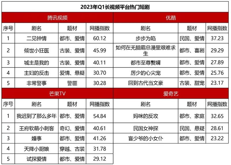 下图为2023年Q1四大平台热度最高的短剧。从题材来看,偶像言情剧依然是几大平台最热门的题材。腾讯视频今年Q1热度最高的五部作品里,排名前三的《二见钟情》、《倾世小狂医》和《城主是我的》均为霸总言情剧;芒果TV今年Q1短剧热度榜同样被偶像言情剧承包,在细分类别上,既有奇幻爱情剧《王府软萌小刺客》,也有穿越类的《天降小厨娘》。
