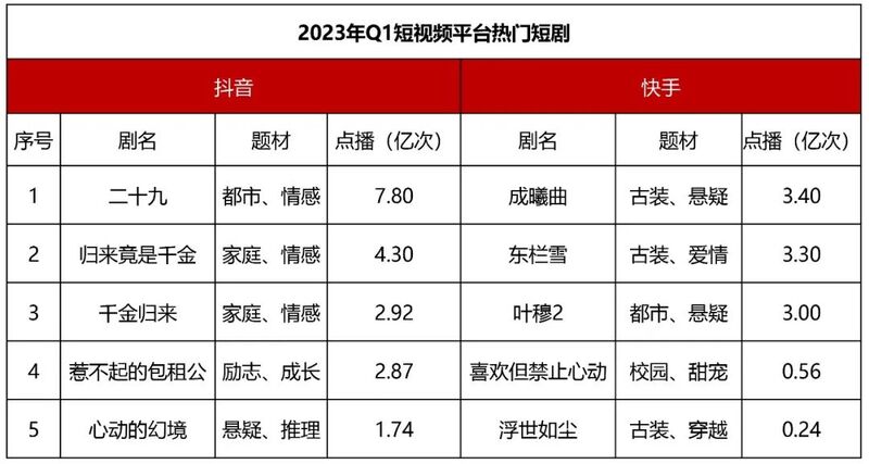 短视频平台的热门短剧画风和长视频平台截然不同。下图为抖音和快手今年Q1热门短剧。断层第一的《二十九》出自柠萌旗下的好有本领,来自大厂牌打造的内容,不管是演员阵容还是故事,或者是制作,对短剧赛道的其他作品来说都是降维打击。