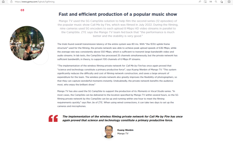 近日,由芒果TV产品技术中心播控部牵头,携手湖南移动、中兴通讯自主研发的“光芒”5G密集视音频传输系统,已被全球移动通信系统协会GSMA认定为全球最具代表性的专题案例在GSMA官网展示(https://www.gsma.com/5ghub/5gfilming)。基于系统的5G重磅内容制作技术解决方案,也已多次亮相行业先锋技术舞台。