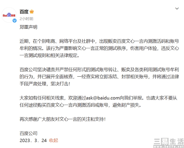 日前百度方面在一则声明中透露,由于近期个别电商、网络平台及社群中,出现了贩卖文心一言内测激活码和账号牟利的情况,严重影响文心一言正常的测试秩序、伤害了用户体验,违反了测试规则的相关法律规定。并表示,坚决谴责并严禁任何形式的测试账号转让、贩卖及各类利用测试账号牟利的行为,已展开全面核查。