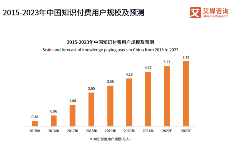 《2022年中国知识付费行业报告》显示,2022年中国知识付费用户数量约5.27亿人,市场规模约1000亿,预计2023年市场规模将突破1800亿。