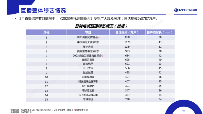 直播综艺(首播):中央广播电视总台制作的《2023央视春节联欢晚会》,日活规模达到3,787万户。