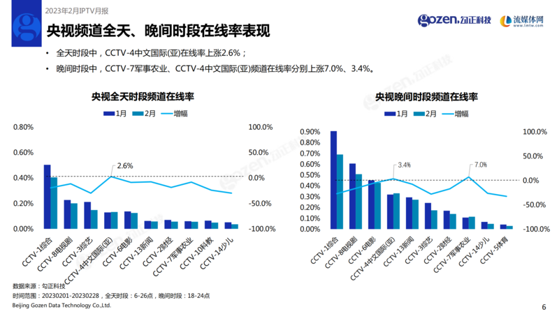 晚间时段中,CCTV-7军事农业、CCTV-4中文国际(亚)频道在线率分别上涨7.0%、3.4%;