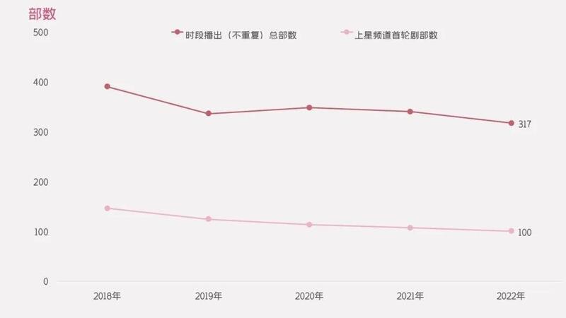 我国上星频道晚黄档是电视剧市场的兵家必争之地,然而近年来电视剧不重复播出部数连年直降,2022年是317部,同比下滑23部。上星频道晚黄档首轮剧部数也每况愈下,2020年是113部,2021年是107部,2022年仅100部(图3)。