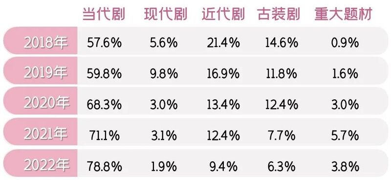 二是现实题材越来越“热”,当代剧“炙手可热”。数据显示,现实题材已成政府主推类型和市场投资重点,虽然在绝对量上也在连年不断减少,但占比一直在提升:2018年占63.2%,2020年达到71%,2022年更是突破80%。其中,当代剧一骑绝尘,从2018年不足60%到2022年的近79%,5年来比重涨幅超过20个百分点。相比之下,近代剧和古装剧比例出现大幅收缩,2022年处于历史最低值。