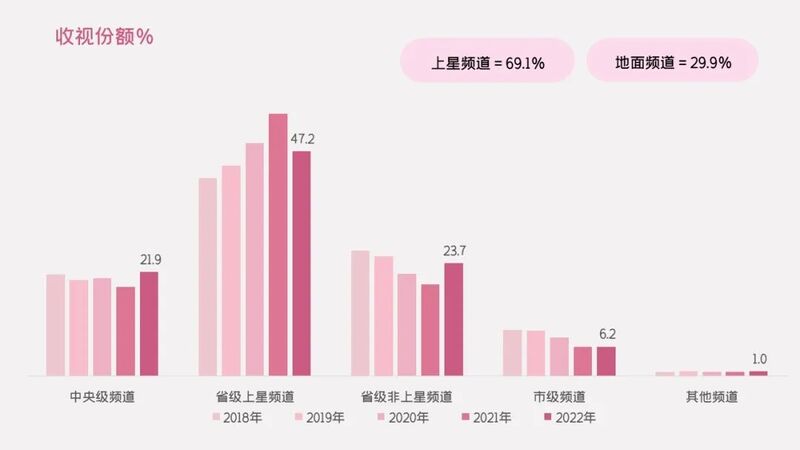 和2021年相比,2022年的电视剧收视份额出现了“一降二升”的局面:省级上星频道出现五年来首次较大跌幅,占比跌破48%,年度下降7.8个百分点;中央级频道组逼近22%,上升3.2个百分点;省级非上星频道组狠狠涨了一截,以23.7%的占比提升了4.5个百分点(图4)。这种此消彼长的态势,鲜明凸显出各级频道在争夺观众注意力的大战中竞争优劣势的波动。