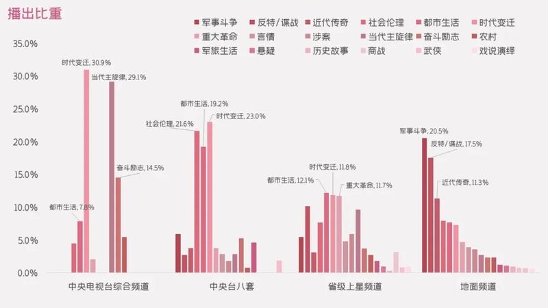 省级上星频道晚黄档剧则试图采取走“平衡木”的战术,在保证主旋律宣传效果的同时,同时兼顾市场化需求:播出比重超过10%的四大类相对均衡:都市生活、时代变迁、重大革命、反特/谍战剧,占比皆在10-12%区间浮动。此外,当代主旋律剧占9.6%,社会伦理剧占7.7%,透露出省级上星频道在主题性题材和自创性题材之间试图两手抓且要硬的意图。