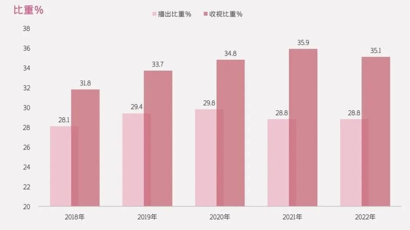 电视剧“稳字当头”,多年来地位稳定,构成了我国电视内容市场的播出和收视主力,疫情期间尤其充当了人们舒缓情感的润滑剂。全国市场,电视剧播出比重2020年增加到34.8%,收视比重2021年达到近年来的最高点35.9%。2022年,电视剧仍是各类节目中的龙头,播出比重是28.8%、收视比重是35.1%(图2)。从供求结构上来看,电视剧在大屏上“供不应求”,吸引了观众最多的注意力,长期充当中流砥柱。