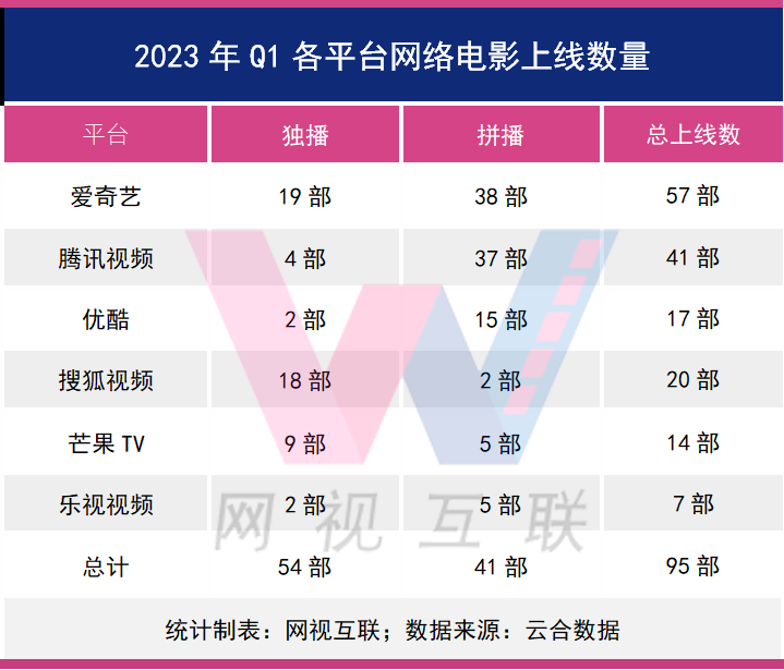 其中爱奇艺独播上线19部,拼播上线38部,总上线数高达57部,占Q1总上线影片的60%,依然是网络电影的播出大户。