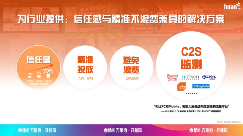 未来,欢网将继续为更多医药行业伙伴提供用户细分触达、全路径沉浸式曝光、创新广告形式、营销闭环等各类智能大屏营销方案,携手突破营销困境,不断释放智能大屏营销力量。