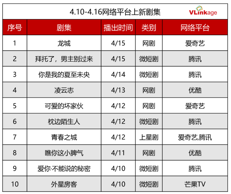 上周各大平台共有10部作品上新,微短剧5部,网剧4部,上星剧1部。从平台覆盖来看,以微短剧为主的腾讯视频,总体占比最多,达到50%;其次为专注长视频的爱奇艺,占比为30%。优酷占比为20%,全为网剧。